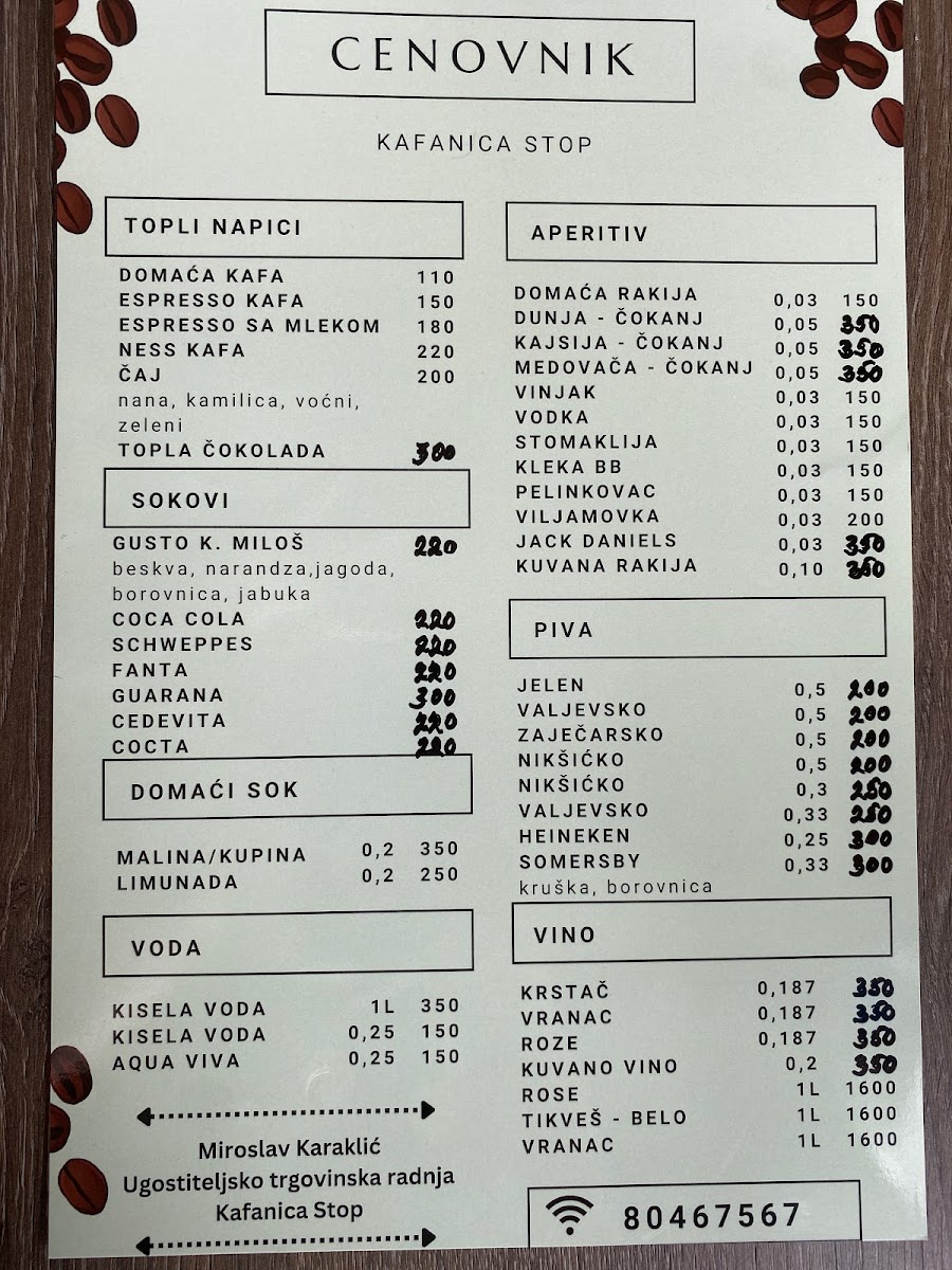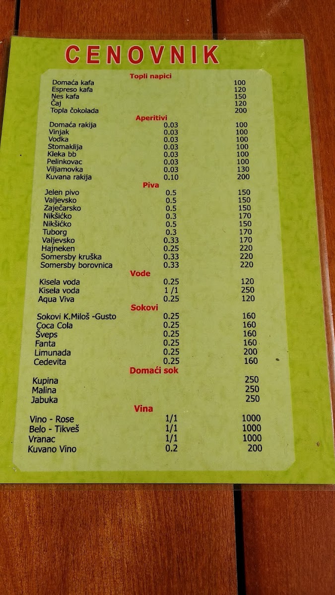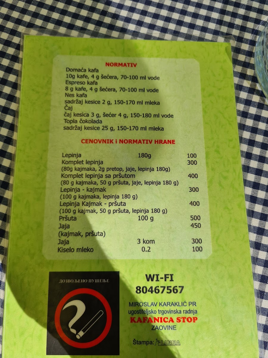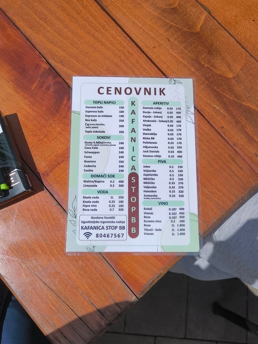 Welcome to Kafanica STOP, a charming cafe nestled in the serene surroundings of Mitrovac, Zaovine, Serbia. This cozy spot is the perfect retreat for those looking to unwind, whether you're enjoying a rich Domaća kafa for just RSD 110 or indulging in a luxurious hot chocolate for RSD 300.